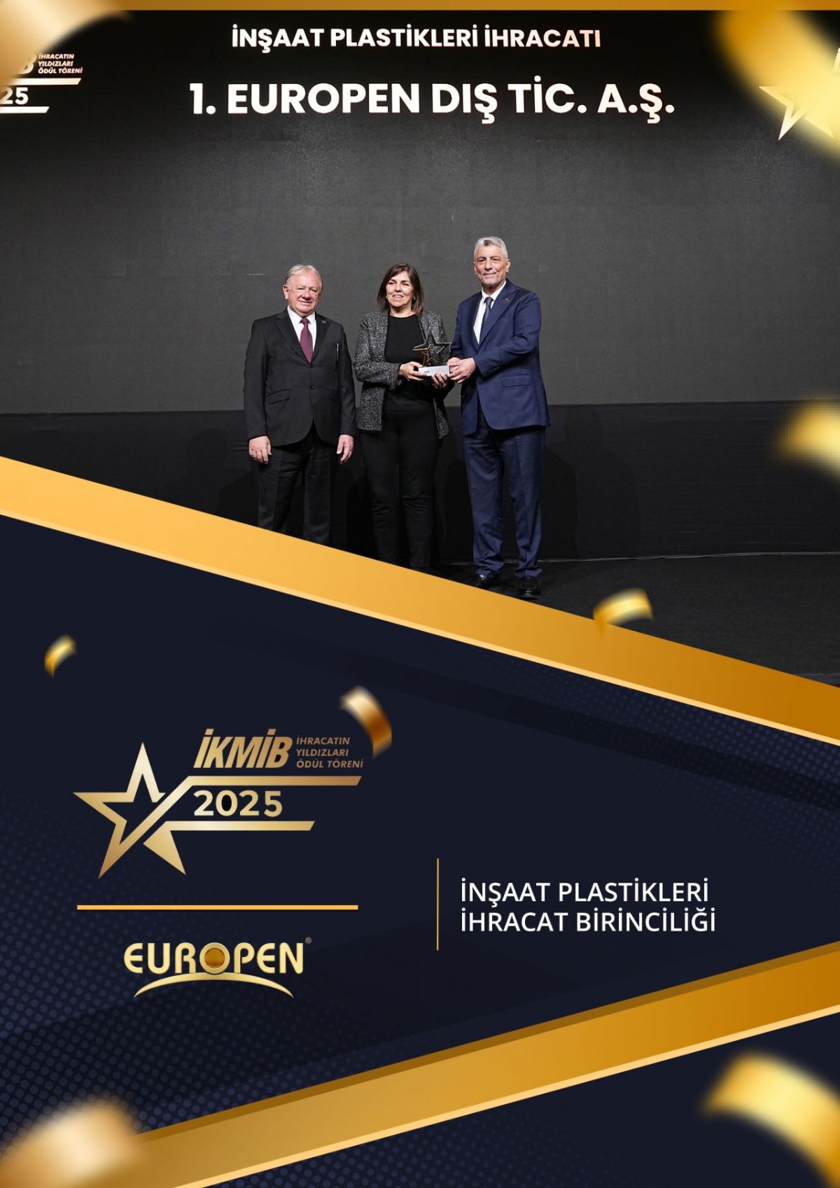 İstanbul Kimyevi Maddeler ve Mamulleri İhracatçıları Birliği tarafından düzenlenen “İhracatın Yıldızları Ödül Töreni 2025” kapsamında Europen olarak “İnşaat Plastikleri” kategorisinde ihracat birinciliğini üst üste 5. kez elde etmenin gururunu yaşıyoruz; ödülümüz, Yönetim Kurulu Üyemiz Sayın Tuğba Öztürk tarafından, T.C. Ticaret Bakanı Prof. Dr. Sayın Ömer Bolat’ın takdimleriyle alınmıştır. Bu başarıda emeği geçen tüm ekip arkadaşlarımıza teşekkür ediyor, ülkemize değer katmaya ve ihracatta güçlü adımlarla ilerlemeye kararlılıkla devam ediyoruz.